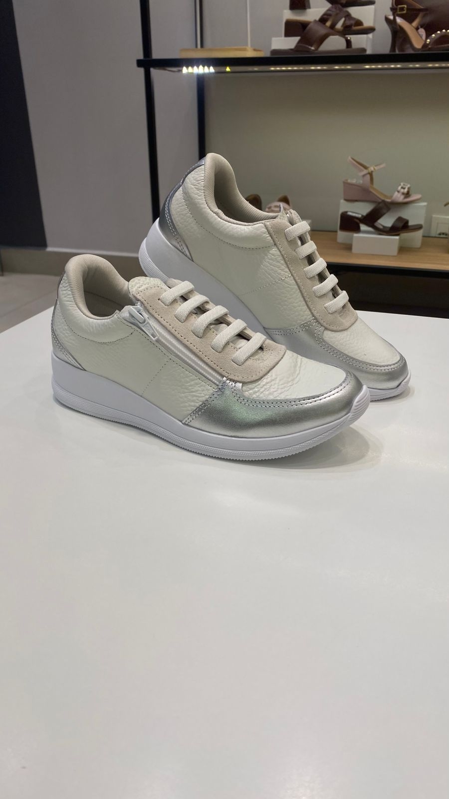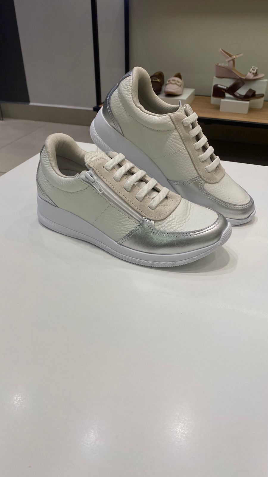 O tênis elástico branco silver combina design moderno com praticidade e conforto. Confeccionado em couro macio de textura natural, possui detalhes metalizados em tom prata que trazem um toque sofisticado ao visual. Seu fechamento em elástico garante ajuste perfeito e facilita o calce, dispensando o uso de cadarços.
