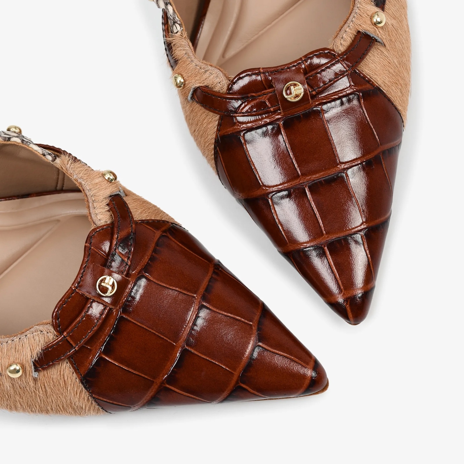 O Slingback Marrom Terroir em Couro Croco foi desenvolvido para quem busca um calçado sofisticado, com design elaborado e acabamento de alto padrão. Confeccionado em couro croco, o modelo se destaca pela combinação de texturas e materiais, que adicionam riqueza visual e reforçam a proposta elegante.