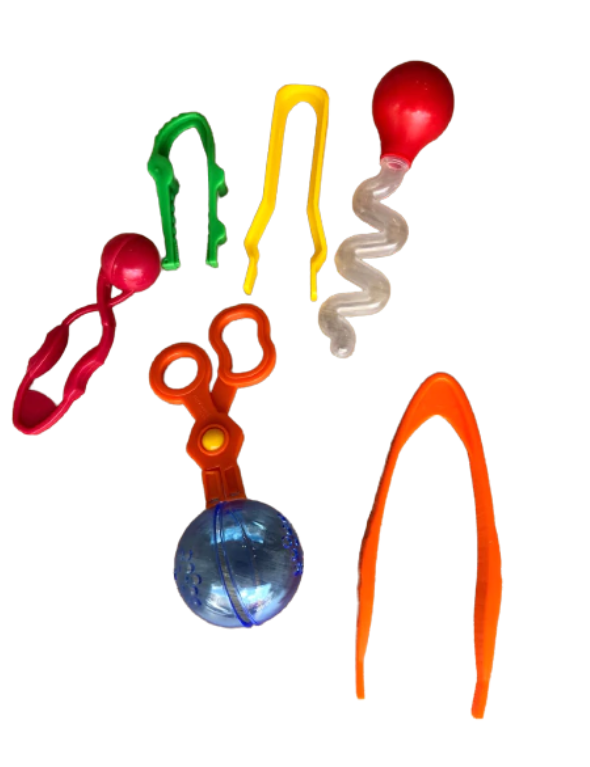 Contém: 1 Pinça bola, 1 Tesoura bola, 1 Pinça grande, 1 pinça larga, 1 pinça jacaré, 1 Conta gotas zig zag, 1 pote grande para armazenamento