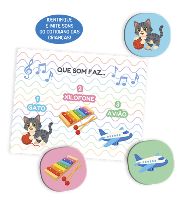 Divirta-se tentando imitar os sons das cartas, e tentando adivinhar os sons dos outros jogadores. É um jogo educativo que estimula a inteligência musical, a percepção auditiva e a imaginação, fazendo com que os jogadores adivinhem sons de instrumentos ou objetos, ou associem sons a imagens, desenvolvendo a criatividade e o aprendizado de forma divertida e interativa. Estimula a identificação de sons, imitação, movimentos e estimulos sensorias.